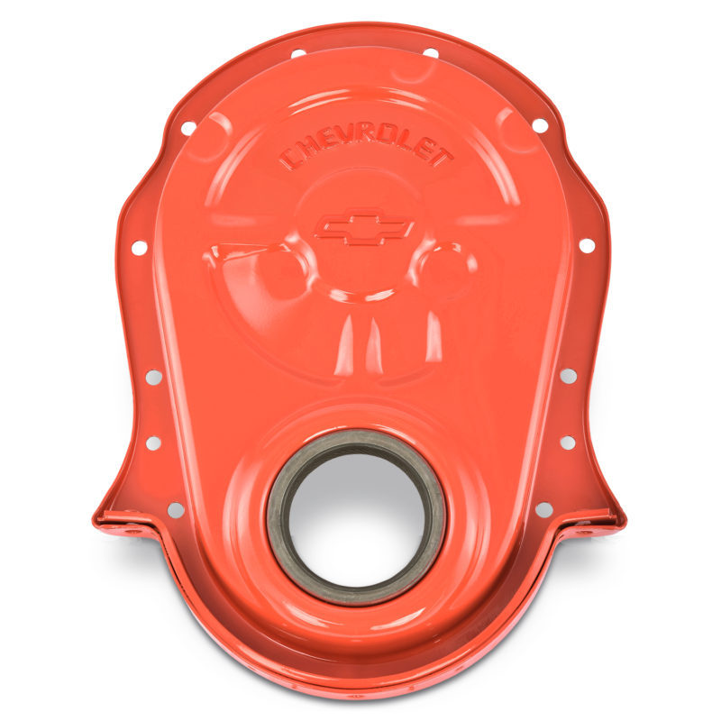 These covers feature the famous CHEVROLET & Bowtie Emblem perfectly in the center. Choose from the iconic Chevy Orange Finish or the ultra-popular Black Crinkle Finish, both with embossed emblems. Direct replacement for all big-block front covers that use a bolt-on timing pointer, and includes an installed OE production oil seal. Add a little something extra to your Big Block setup or finish off the look with the valve covers you already own! Made from stamped steel. Replacement oil seal: GM P/N 3860095. For Big Block Chevy 396-454 V8 Engines; 1965-1990.