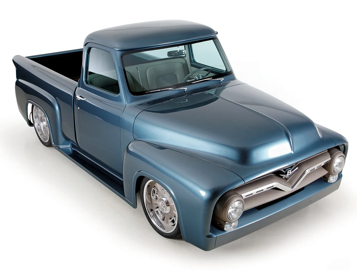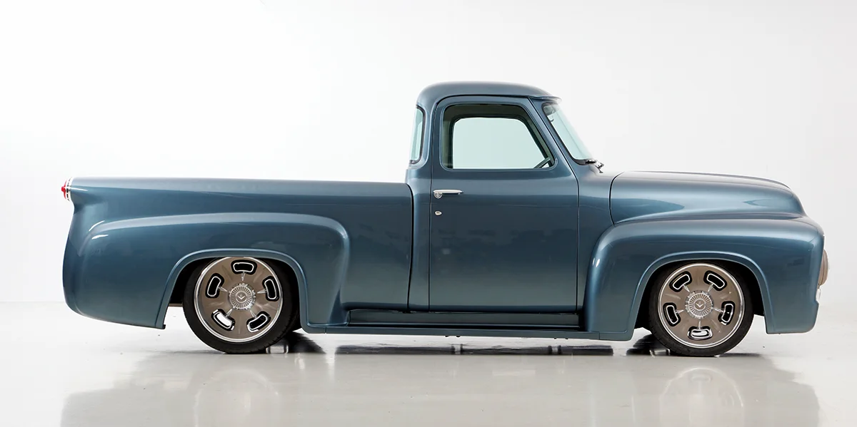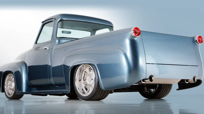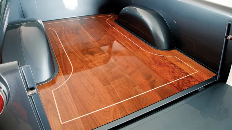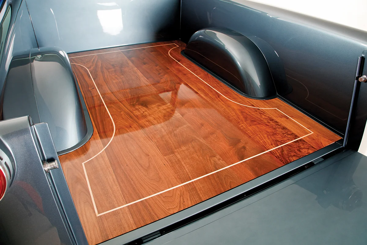 I decided to bring the truck back to California to finish. I owned a body shop when I was younger so the journey began. I scrapped the hood, front fenders, core support, firewall, cab floor, doors, added new front cab corners and another cowl. The bed was made of quarter panels from a 1955 Ford panel truck with 1954 Ford station wagon taillights. The bed floor is made of Black Walnut with a maple inlay finished with automotive clear.