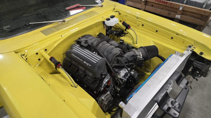 A few years later, the car underwent another major transformation. The big block was replaced with a modern 392 Gen 3 HEMI controlled by a Holley Terminator Max X ECU, paired with a ZF 8HP70 eight-speed transmission. Suspension was upgraded again with a QA1 coilover system and Wilwood disc brakes, while a Moser Engineering 8¾ rear axle was added for the track.