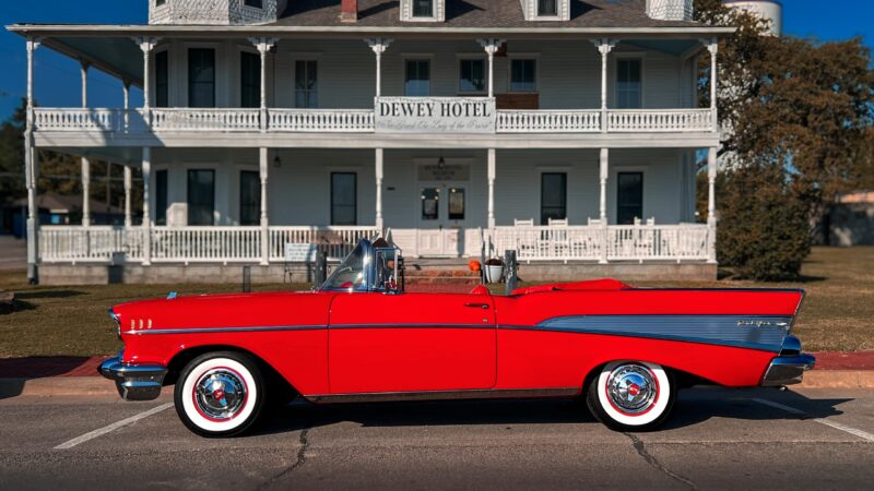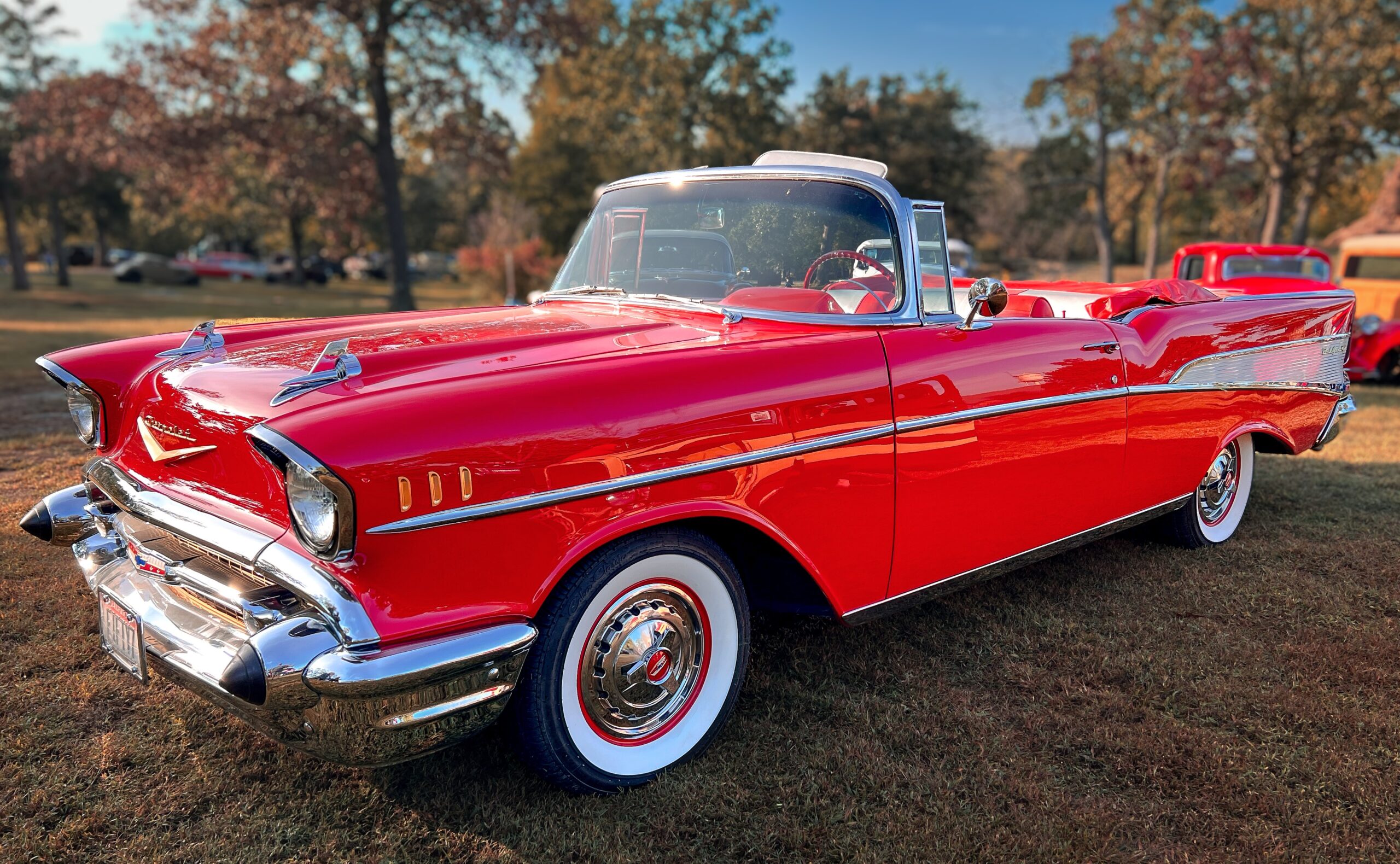 Power Pack 283 (2 x 4 bbl, 270hp) and 3-speed manual “3 on the tree” trans. The car is essentially stock, other than the Coker Tire retro radial white wall tires